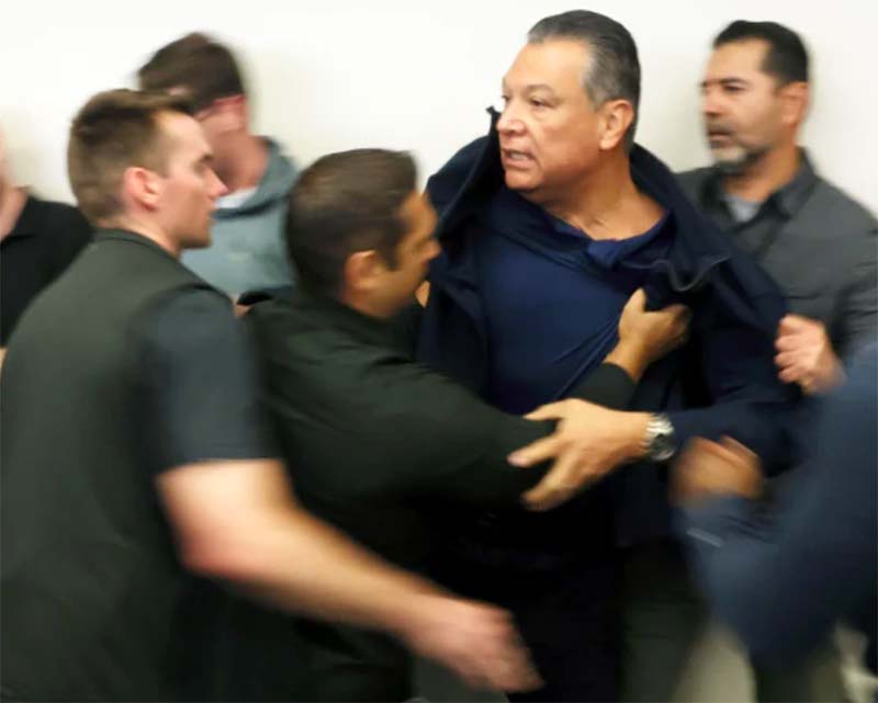 Alex Padilla is one of California's two senators. That's him in the photo about to be wrestled to the ground and handcuffed after introducing himself at a press conference and saying he had a question for DHS Secretary Kristi Noem.